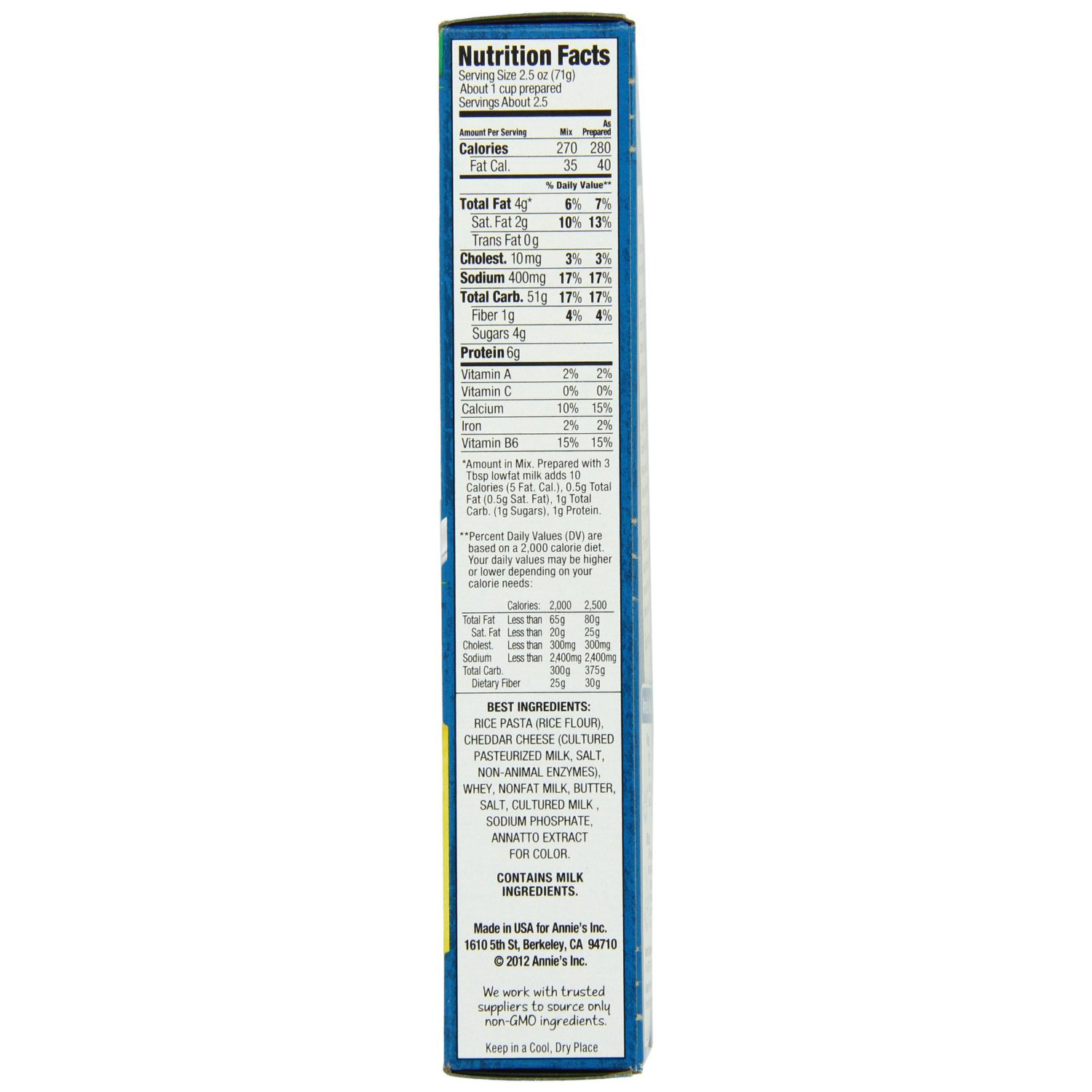 Rice Pasta (White Rice Flour, Brown Rice Flour), Dried Cheddar Cheese (Cultured Pasteurized Milk, Salt, Non-Animal Enzymes), Whey, Nonfat Milk, Butter, Salt, Cultured Milk, Sodium Phosphate, Annatto Extract (For Color), Silicon Dioxide (For Anticaking).