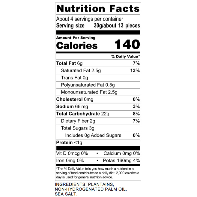 Artisan Tropic Sea Salt Plantain Chips are a taste of the tropics. They provide the perfect crunch for a healthy snack or side dish. Because of the long strip cut they have, they are perfect for dipping in guacamole or salsa. And no worries, we use Sea Salt to provide you with more beneficial minerals! That’s what we like to call: Healthy. Snacking. Redefined.