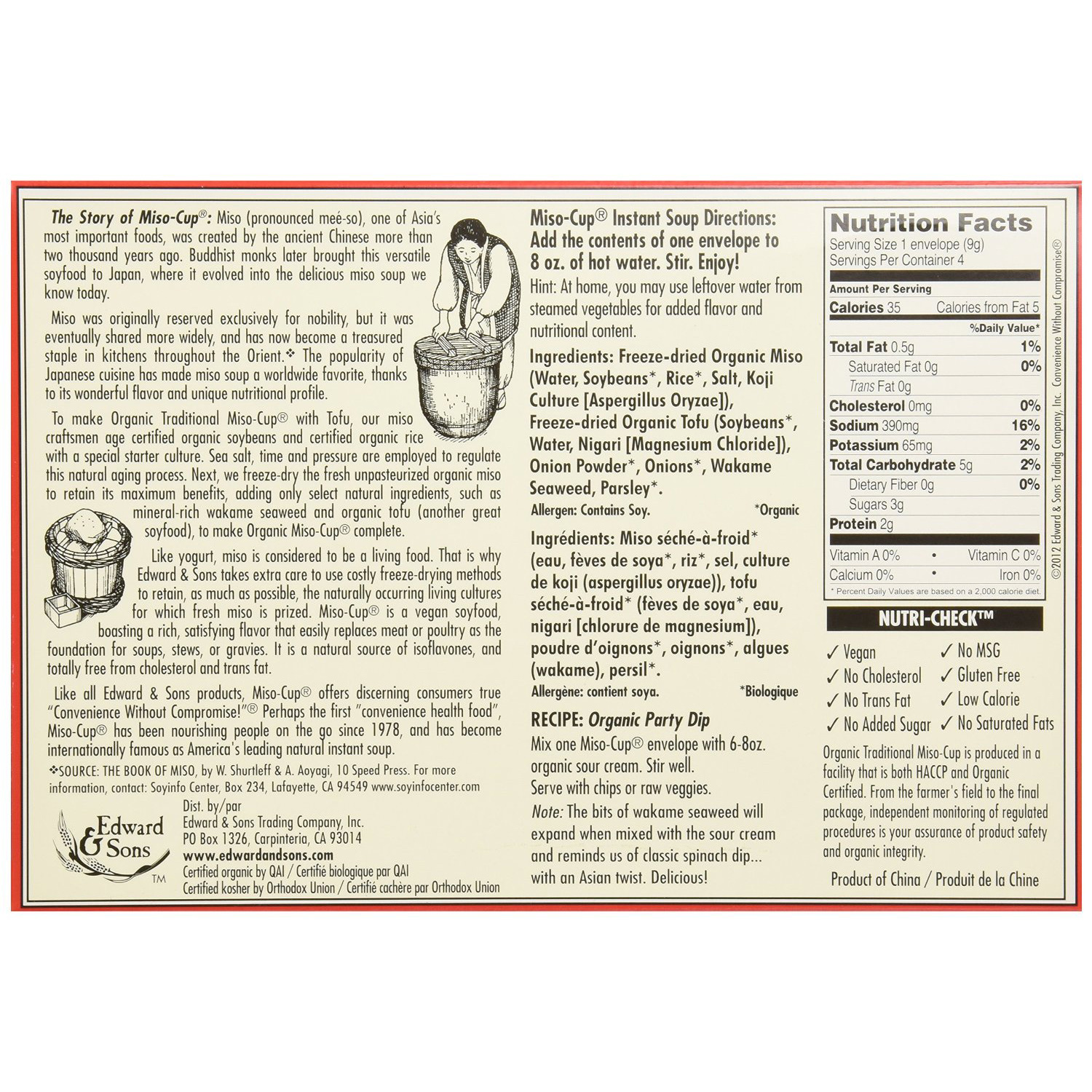 Miso-Cup® is a Godsend to travelers (or to anyone with a busy lifestyle), and requires only hot water for instant preparation. It is a fully vegan source of complete protein, thanks to its complementary amino acids, naturally derived from miso's cultured rice and legume ingredients. Today Miso-Cup® continues to delight with its great taste and its simple, wholesome ingredients, free of MSG or other questionable additives.