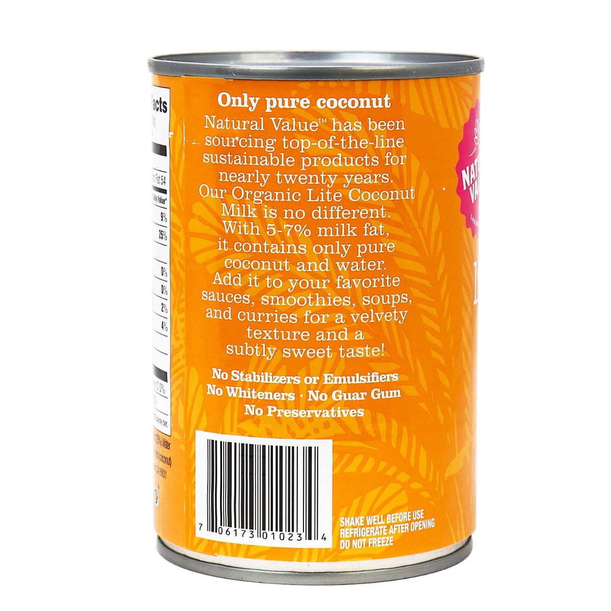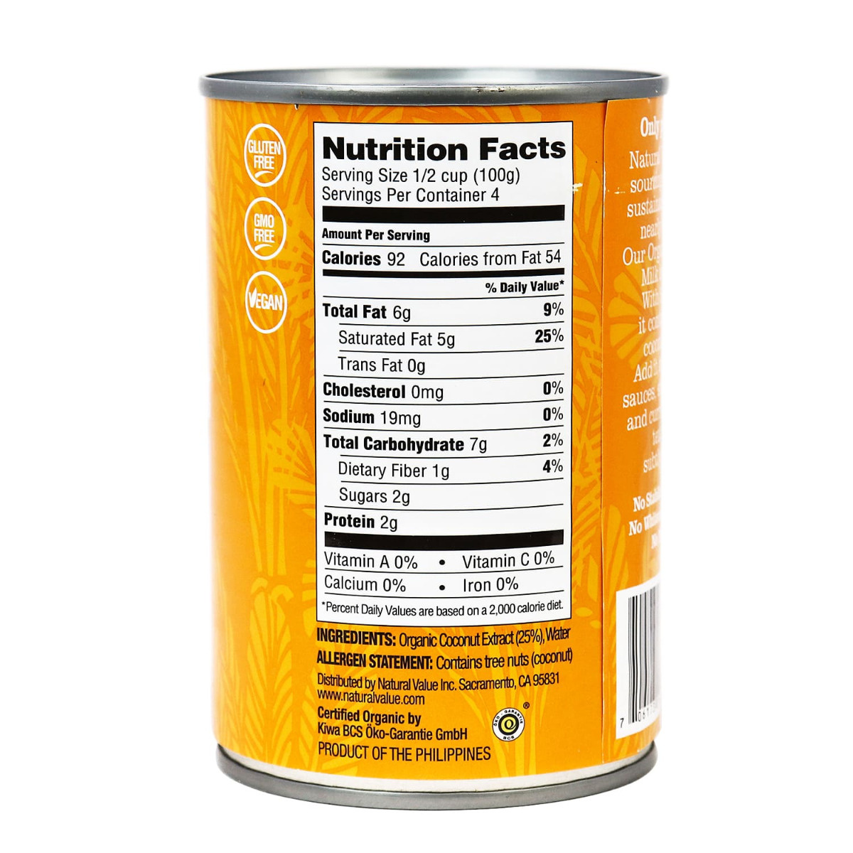Natural Value Organic Coconut Milk is a Top-of-the-Line Organic Coconut Milk. It contains 5-7% milk fat. To make it, we take coconuts, remove the outer shell, and take the coconut meat inside, add water and puree it. Made with deep well water processed via reverse osmosis filtration. Nothing added. Natural Value Coconut Milk is paleo and whole30 friendly.