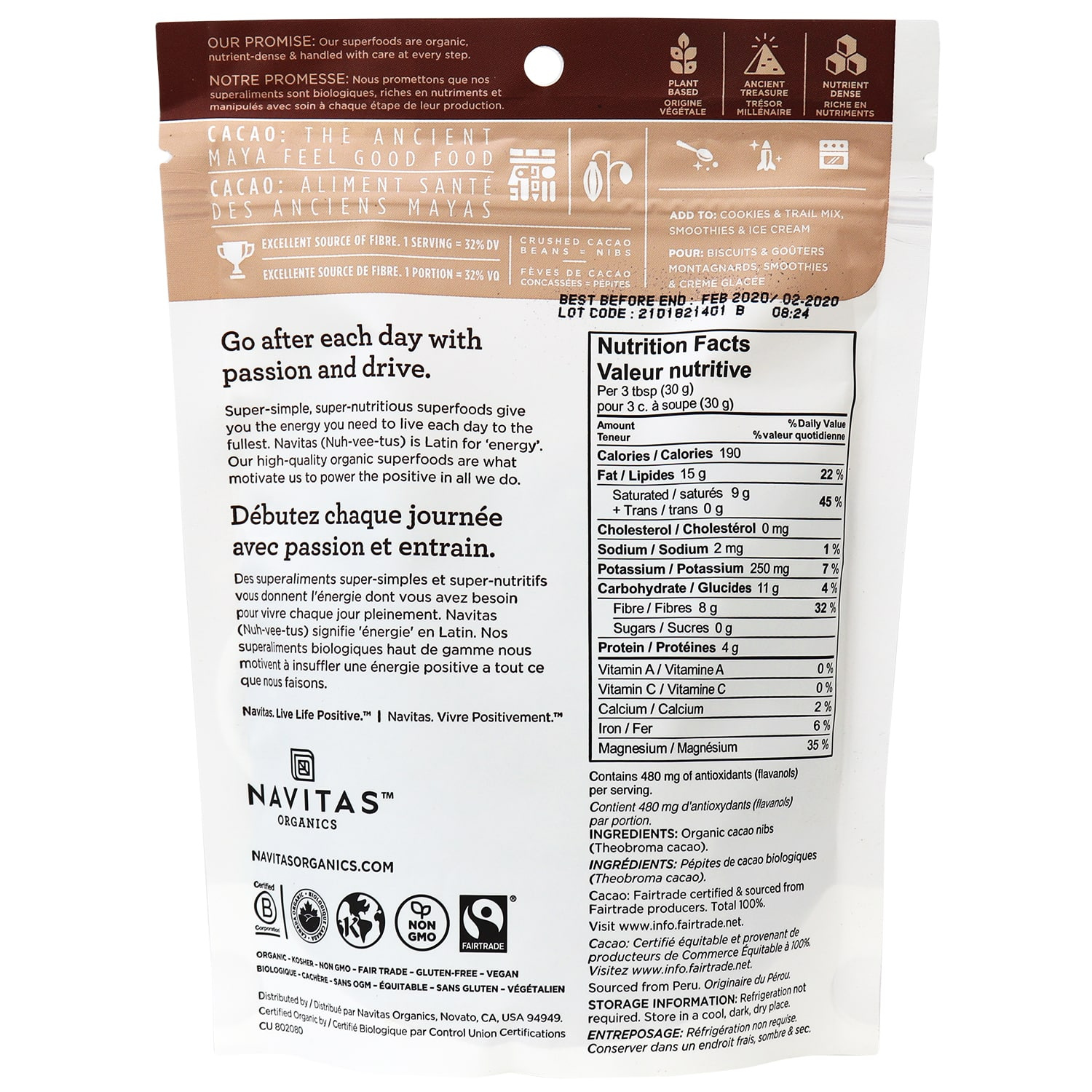 Peeled and crumbled from whole Cacao beans, Cacao Nibs are one of the most antioxidant-rich foods on the planet. Navitas Organics Cacao Nibs are also packed with fiber and vital minerals, including magnesium and iron. Unsweetened, they have a rich chocolate taste and a satisfying crunch with the slight bitterness expected of exclusive dark chocolate. Want just a hint of sweetness? Try Navitas Organics Cacao Sweet Nibs.