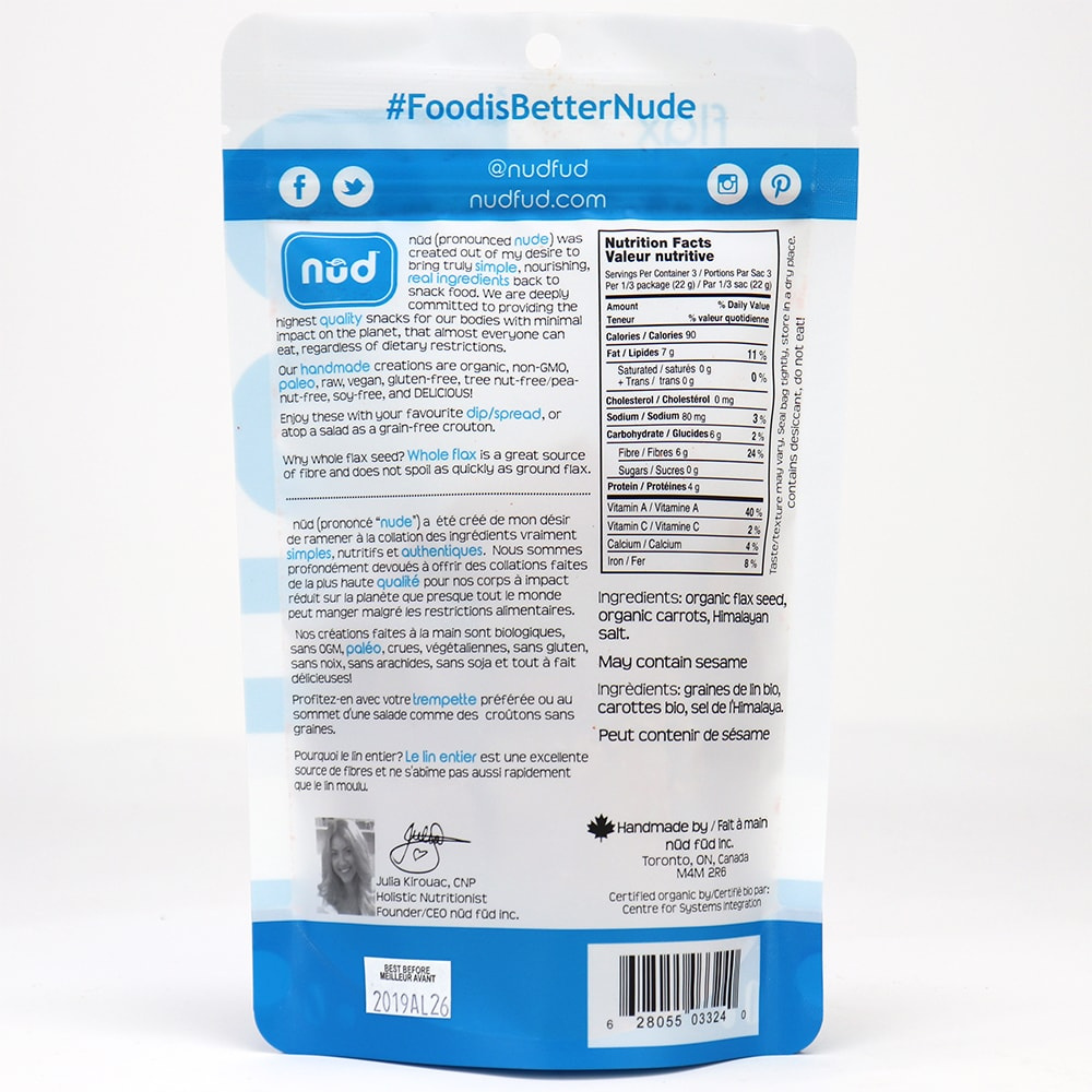 Since we use premium golden flax seed, these provide a slight buttery flavour, while the carrots provide a subtle sweetness. These are a great traditional cracker replacement that are nutrient-dense, yet still subtle enough to pair with anything (sweet or savoury).