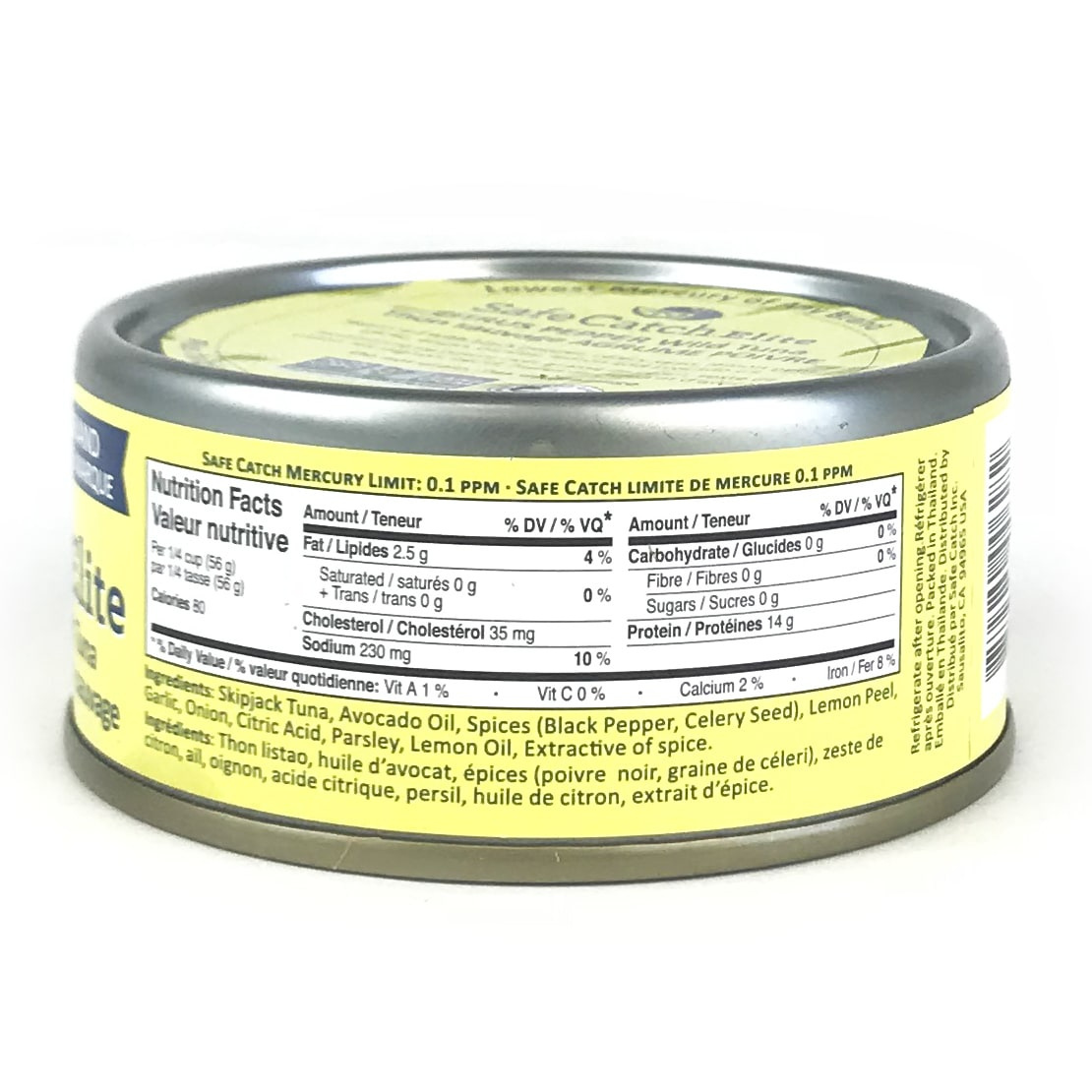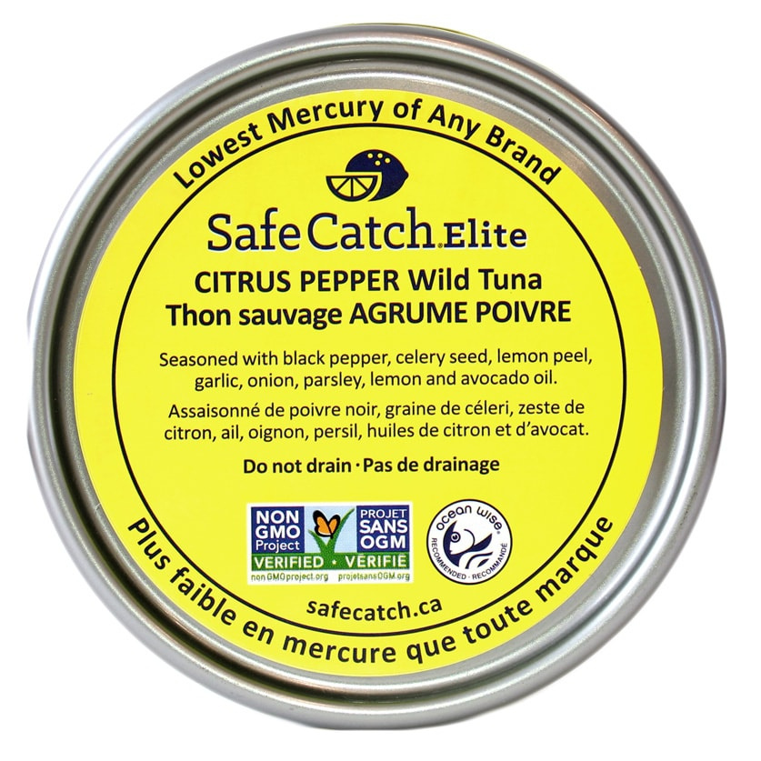 The Safe Catch Seasoned Elite line pairs our lowest mercury tuna (Elite) with all natural premium ingredients. Citrus Pepper is seasoned with all natural black pepper, celery seed, lemon peel, garlic, onion, parsley, lemon, and a touch of avocado oil!